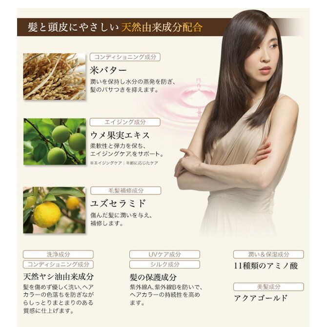 米バター、ウメ果実エキス、ユズセラミドなど天然由来成分を配合したシャンプー。