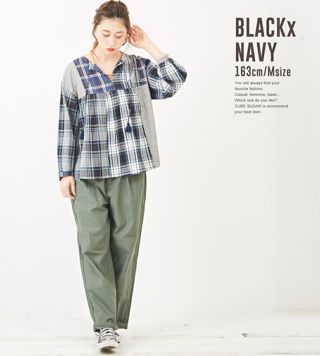 5/18 20:00start 春SALE【50%OFF】チェックブラウス / 春新作 / CUBE SUGAR インド綿ミックスチェック プルオーバーブラウス (3色): レディース トップス ブラウス 長袖 タッセル リボン パッチワーク ストライプ インド キューブシュガー