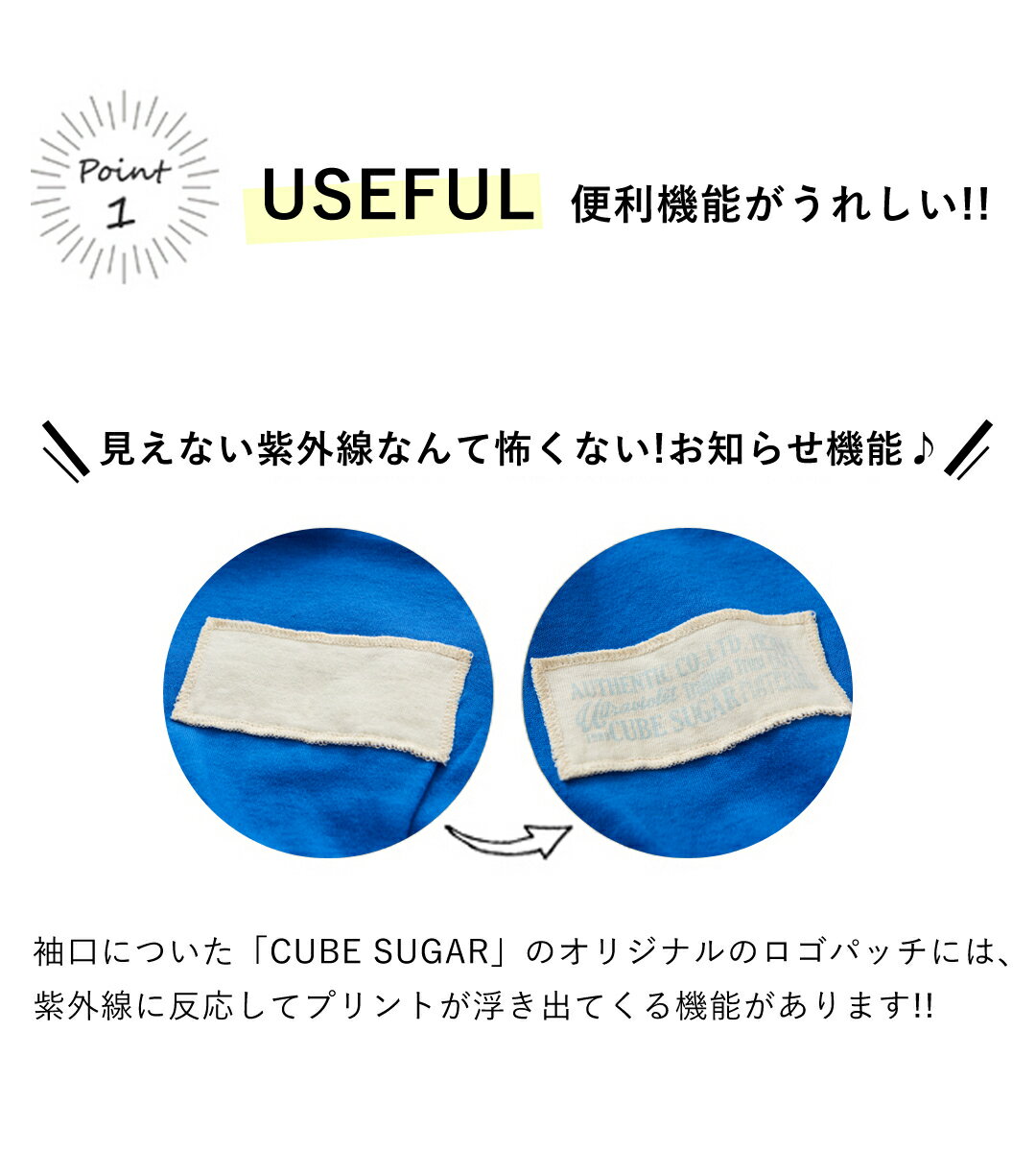 紫外線の強さを知らせてくれる、特別なロゴネーム 袖口についたオリジナルのロゴパッチは、紫外線に反応するとデザインが浮き出るスペシャルネーム。